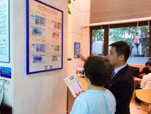 电子显示屏在滚动播放着第五套人民币的官方视频介绍,厅堂里的醒目位置张贴着新版人民币宣传海报,资料角则整齐摆放着反假货币宣传手册,吸引客户或驻足观看、或随手取阅。这是兴业银行上海分行在新版人民币上线之际打造的厅堂氛围。